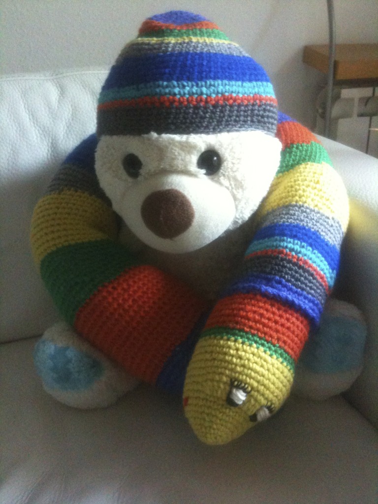 Y el regalo lo estuve dudando porque me gusta regalar cosas hechas por mi....y al final le hice una serpiente amigurumi gigante con un gorro para Jan a juego...